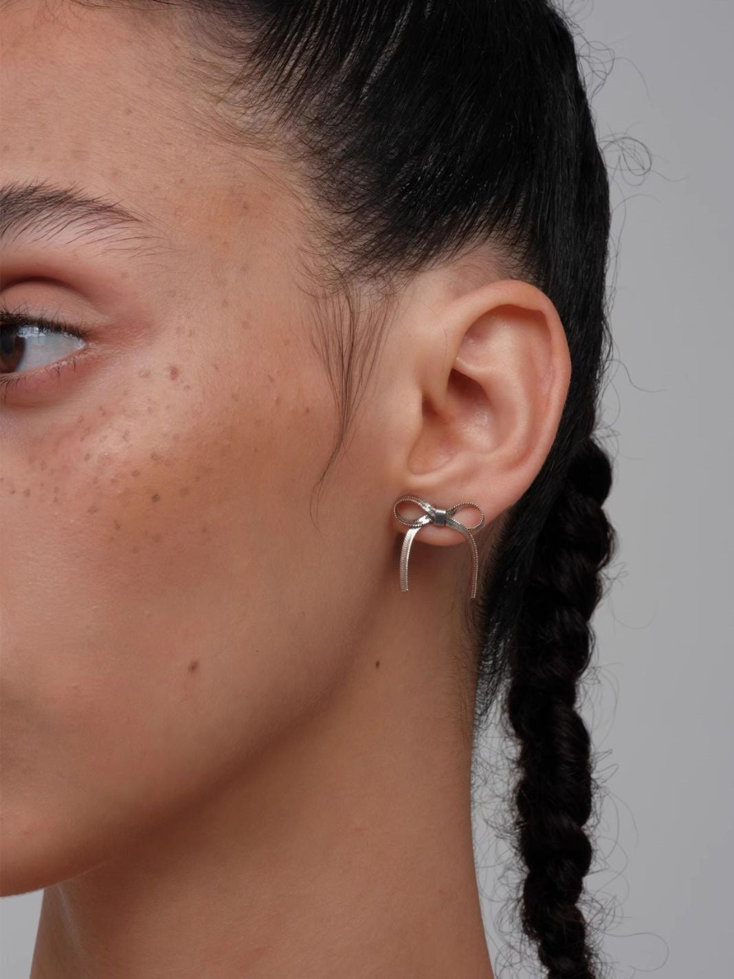 Delicate silver bow stud earrings with graceful dangling tails—charming, feminine, and perfect for adding a playful touch to any look.